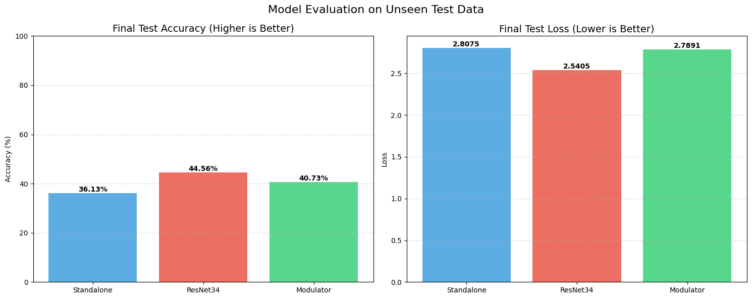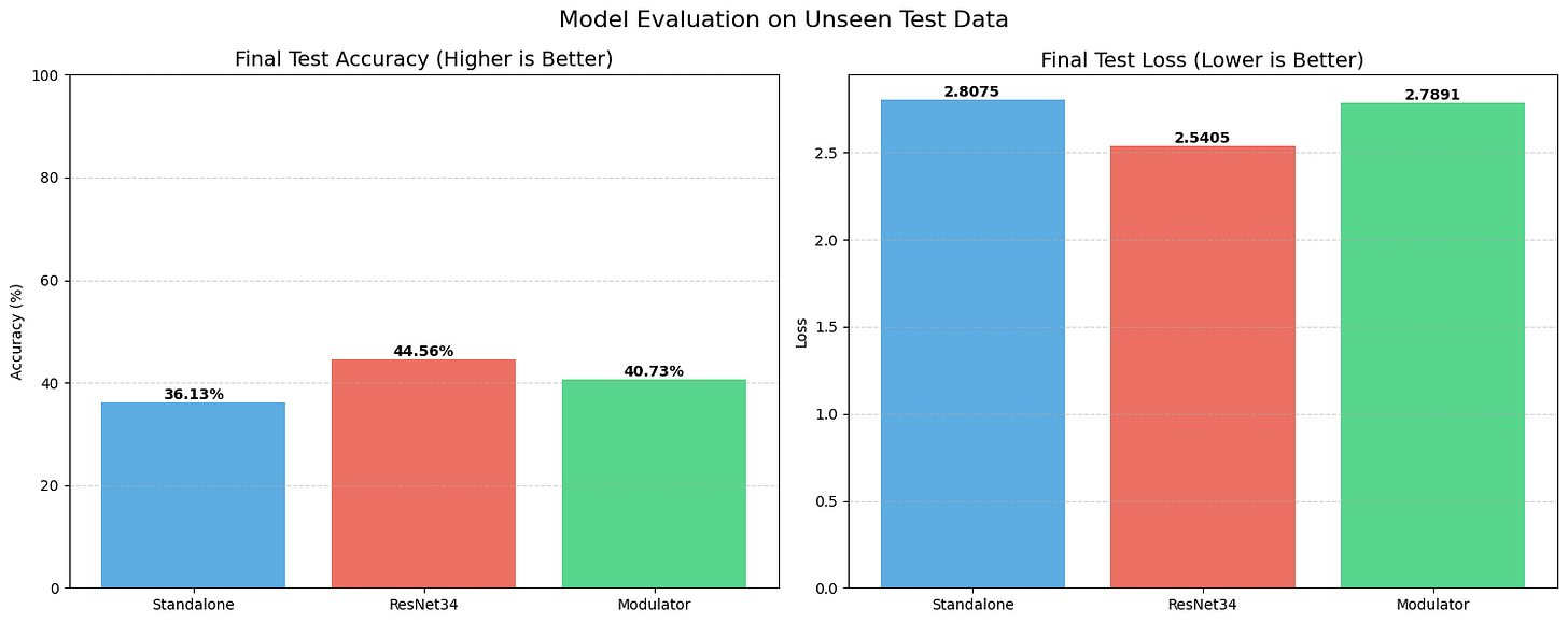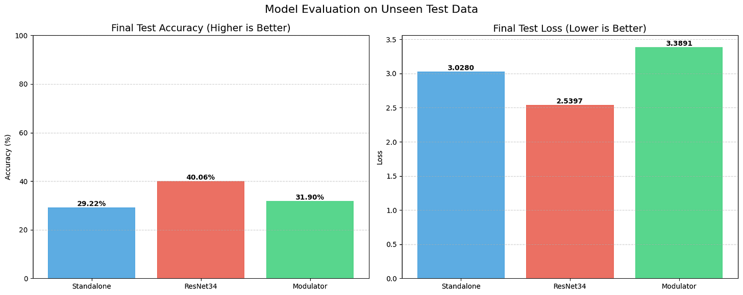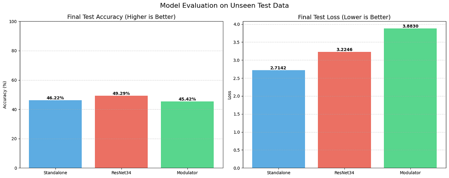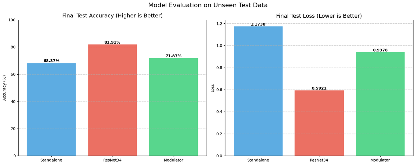 STRAW, however, acted as a regularizer. Even with this tiny amount of training data, the Modulator managed to push the test accuracy up to 71.87%, with a lower loss of 0.93. It shows that when data is scarce, having a dynamic weight generator helps the model adapt to unseen examples better than a static set of weights can.