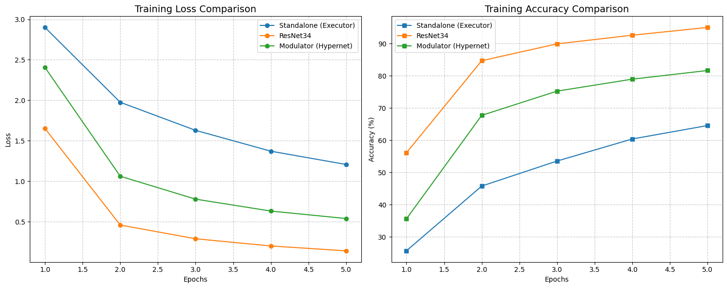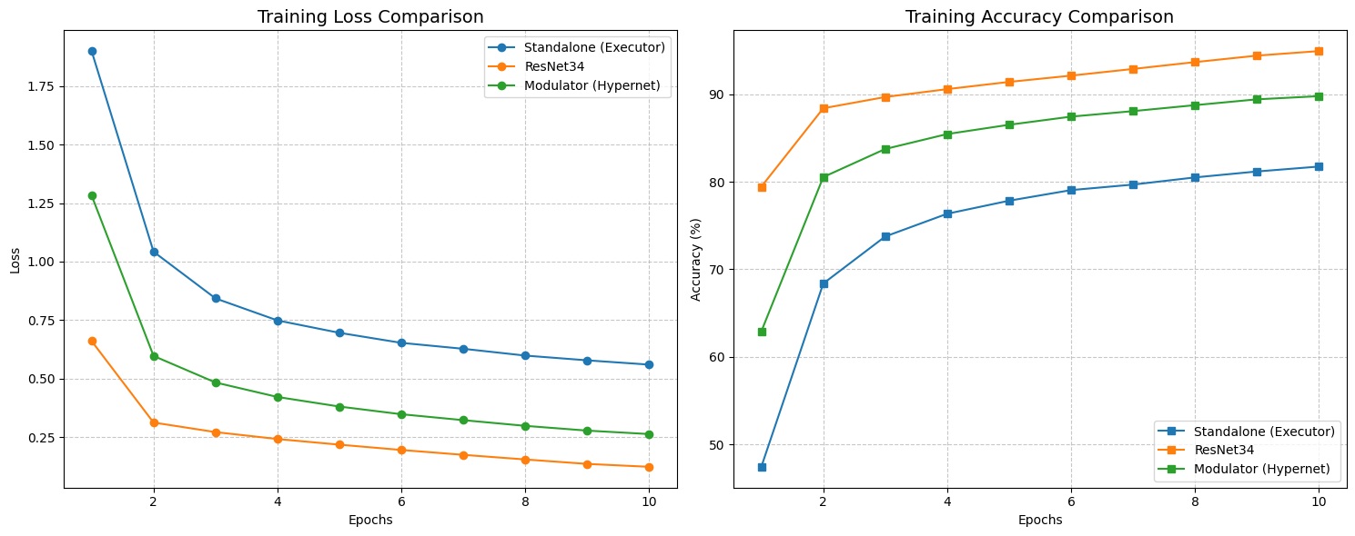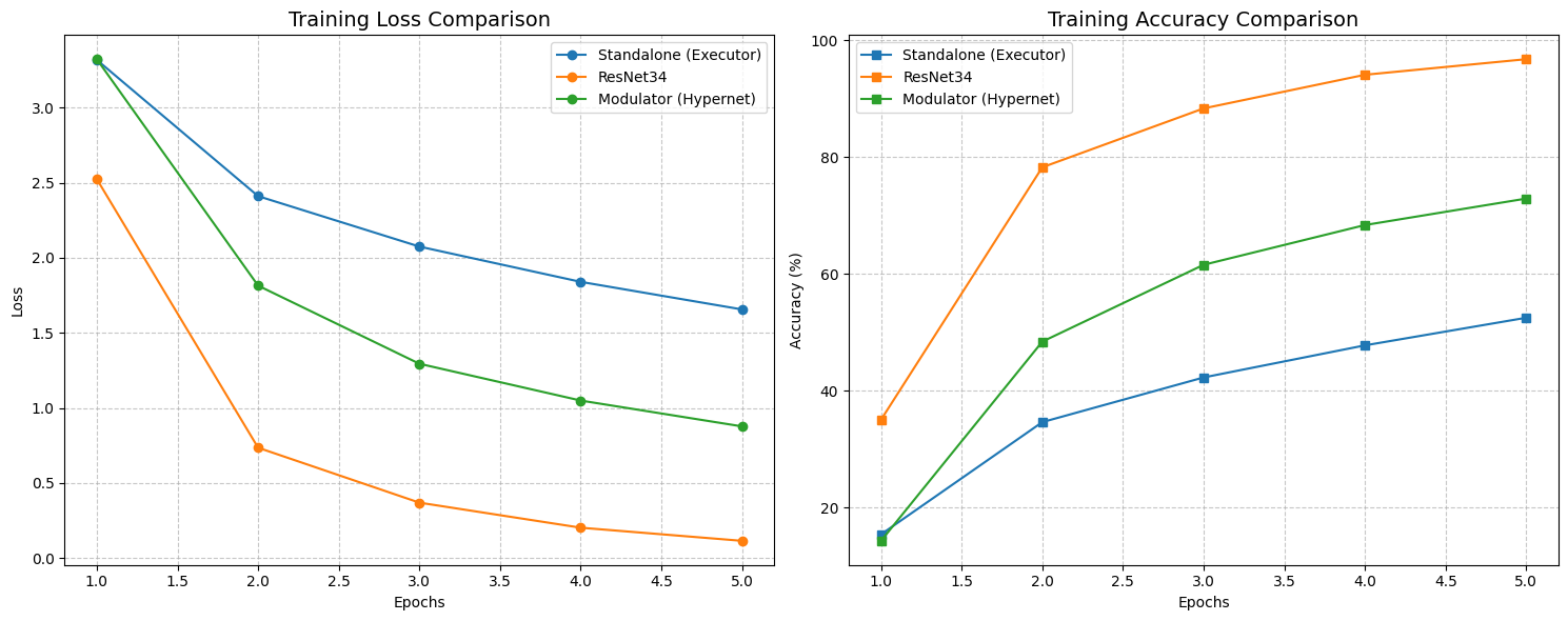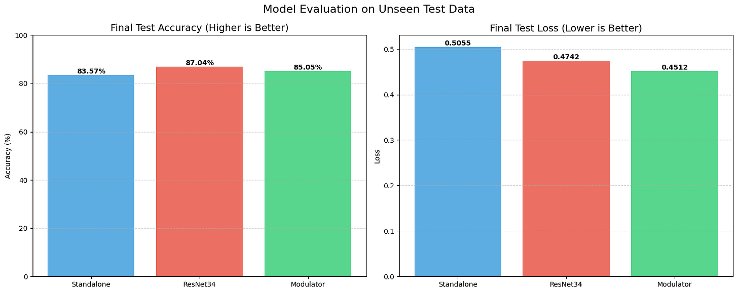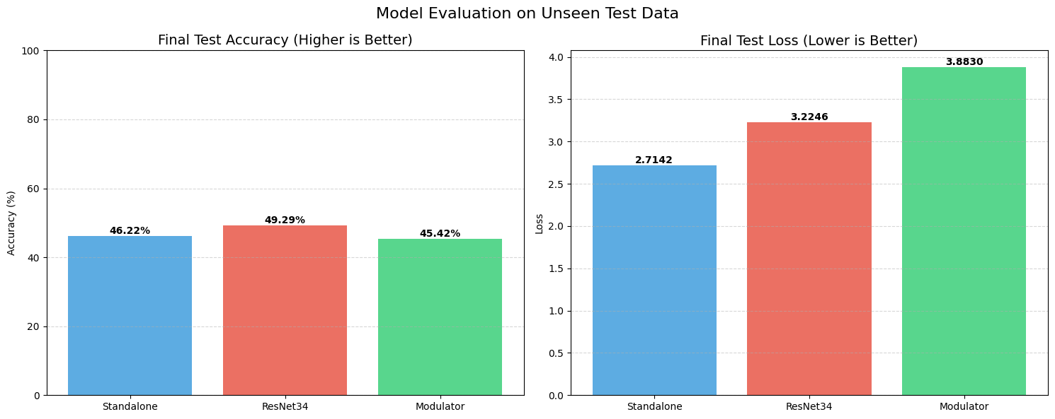 STRAW, however, acted as a regularizer. Even with this tiny amount of training data, the Modulator managed to push the test accuracy up to 71.87%, with a lower loss of 0.93. It shows that when data is scarce, having a dynamic weight generator helps the model adapt to unseen examples better than a static set of weights can.