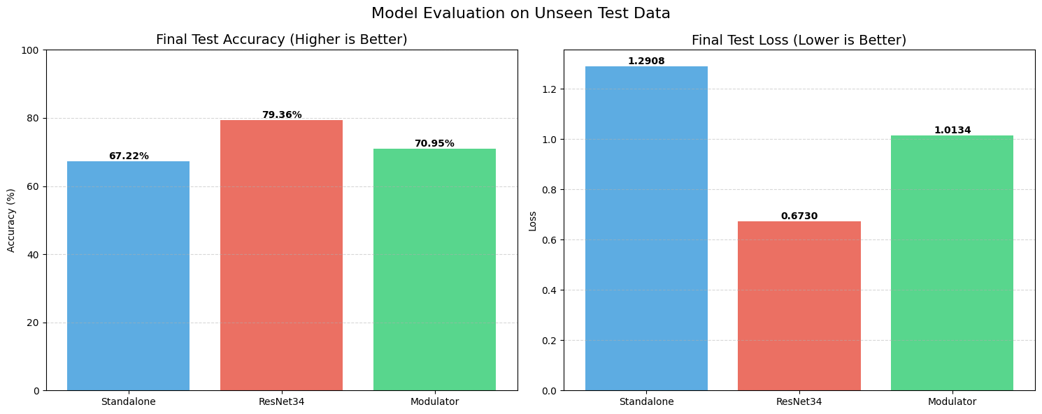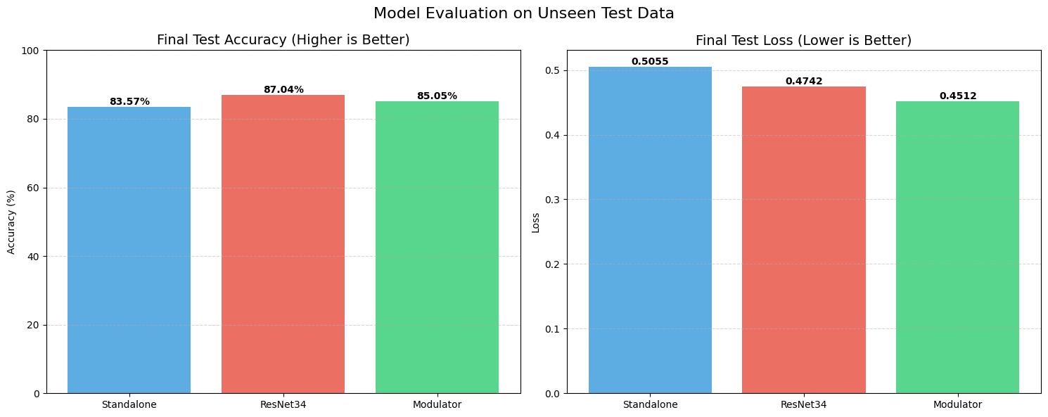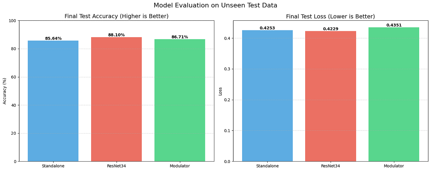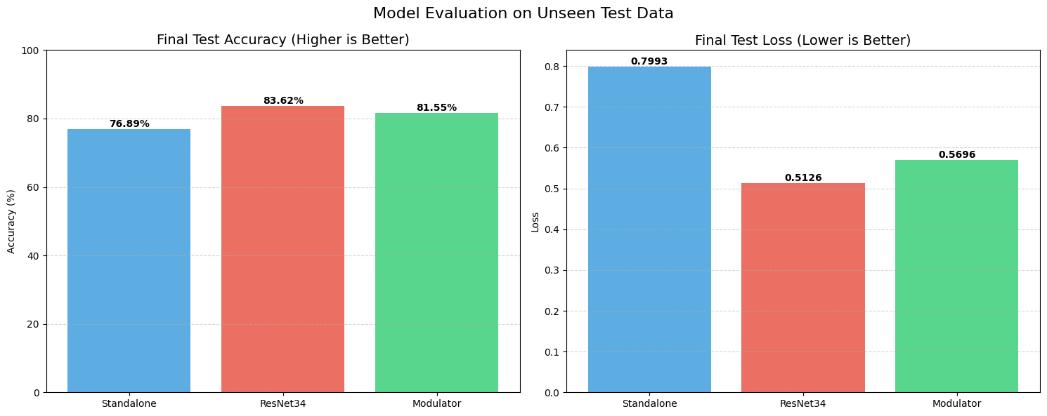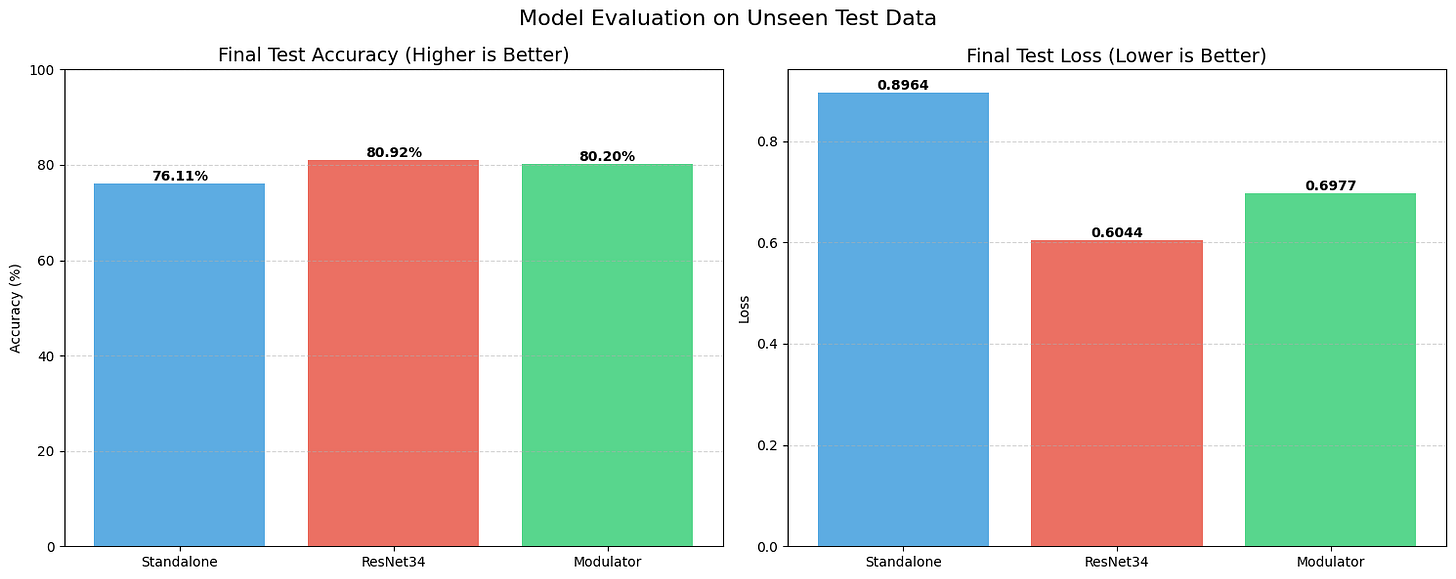 The Standalone model struggled significantly here. It couldn’t generalize well, hitting a test accuracy of only 68.37% with a massive loss of over 1.1. It essentially started memorizing and guessing.