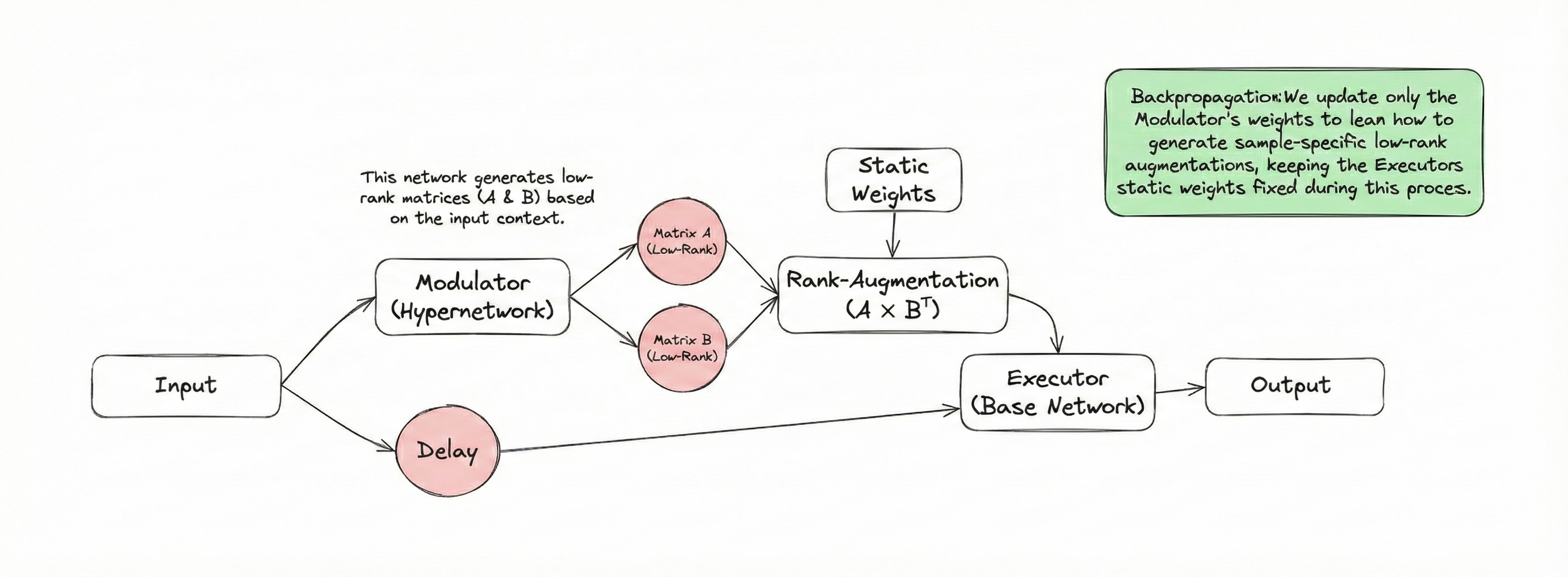 Instead of generating the full Delta_W, we assume that the necessary adaptation for any given sample lies in a low-dimensional subspace. We use the LoRA (Low-Rank Adaptation) formulation, but make it dynamic.