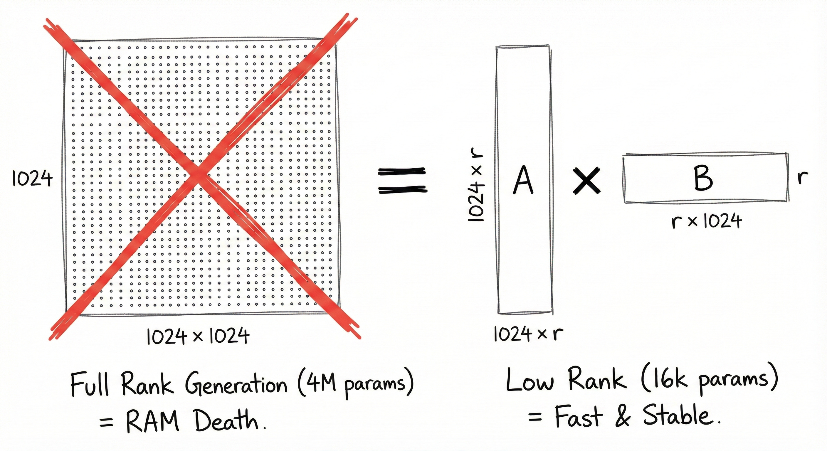 This 64x reduction is the only reason this approach is trainable on consumer hardware.