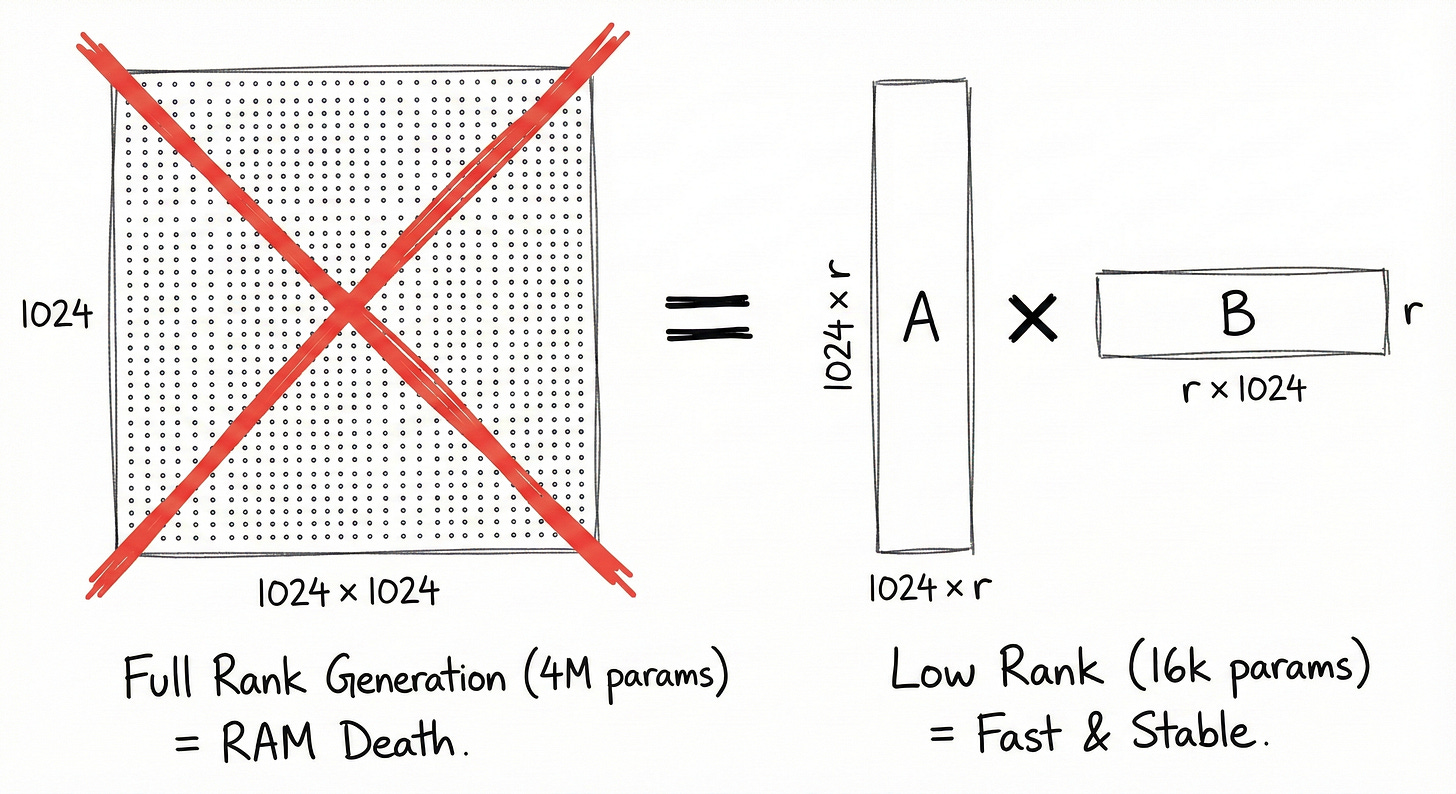 If you have a layer with dimensions 2048 * 2048, that’s roughly 4 million parameters. To generate that per sample, your generator needs to output 4 million numbers. That explodes memory and is impossible to train stably.
